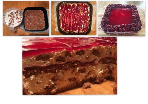 Vahustasin koore koos natukese suhkruga vahule ning lisasin jogurtid. Maitsestasin veel natuke vaniljesuhkruga. Panin želatiini veevannile sulama ning samal ajal purustasin täidisesse küpsiseid. Želatiin valmis, lasin veidi jahtuda ning lisasin täidisele. Panin poole hoolega segatud täidisest koogivormis olevatele küpsistele. Ladusin teise kihi küpsiseid täidisele ning panin natuke pohlamoosi ning siis ülejäänud täidis.